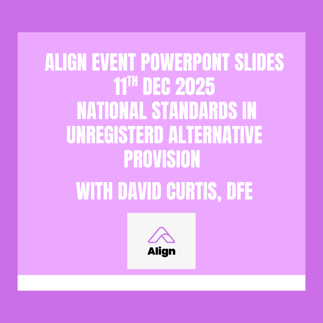 Resources Helpful documents for those working in and with unregistered alternative provisions. ALIGN Resources 11th Dec ALIGN DFE Event Notes & Summary 11th Dec ALIGN DFE Event Powerpoint Slides Official Statement in Response to DFE Proposals 19th Nov 2025 ALIGN event response to DFE proposals 11th Sept 2025 ALIGN DFE meeting summary (Jan 2025) [Draft of] ALIGN Guidance for Unregistered AP (Dec 2024) Reports & publications Consultation Response (August 2025) Non-School AP – Voluntary National Standards (August 2025) Keeping Children Safe In Education Guidelines (September 2025) What Works: Four Tenets of Successful Internal AP (June 2025) Arranging Alternative Provision Guidelines (Feb 2025) Public Accounts Report on Children with SEND (Jan 2025) Children with complex needs who are deprived of liberty (Nov 2024) Analysis of Call for Evidence on Use of Unregistered AP (May 2024) An Alternative Route: Post 16 Support.... AP (May 2024) Reasonable Force, restraint and restrictive practices (April 2024) Children Missing Education: The Untold Story (Sept 2024) Youth Justice Board Strategy 2024-2027 (April 2024) Outcomes for Pupils who Experience Multiple Suspensions EPI Report (March 2024) Children's Commissioner's Report (Feb 2024) SEND & AP Improvement Plan (2023) Thematic Review of Alternative Provision in Local Areas (2024) Consultation on Unregistered AP /Draft Framework (May 2024) Joseph Rowntree Report Report on Destitution (2023) Social Mobility Report from the Sutton Trust (2023) IntegratEd Toolkit & Report (2022) Government Guidance Docs Pupil Behaviour Survey (April 2024) Creating a School Behaviour Culture Audit (April 2024) Alternative Provision Specialist Taskforces (March 2024) Online School Accreditation Scheme (2024) ITT For SEND & AP (May 2023) Keeping Children Safe in Education (2023) Working Together to Safeguard Children (2023) Policy Statement on Un-Registered Schools (2019) Independent School Standards (2019) Unregistered Independent Schools & Out of School Settings (2018) Investigate Research into Alternative Provision (2018) Alternative Provision Statutory Guidance (2013) Children Missing from Education (2016) Safeguarding-specific resources Race, Racism & Safegaurding Children (March 2025) NSPCC: Understanding and responding to sibling sexual harm and abuse (Nov 2024) What role does social media play in violence affecting young people? (Nov 2024) Helpful links Z Register an Independent School Checklist p Independent School Inspection Process p Guide to Starting an Alternative Provision p Excluded Lives Research Project Home Page w What the research shows us about good quality AP p AP Research Network Website Video, podcast & webinar content Alternative route: what's the picture in AP? (Ofsted Talks) The AP Market & Progress Tracking in AP What is Alternative Provision & Who is it For? Bullying, Victimisation & ACES seminar
